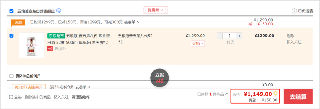 据五粮液京东自营旗舰店的价格数据,53度500ml第八代五粮液优惠前单价为1299元,优惠后到手价为1149元,与指导价1499元的价格相比,倒挂十分明显。