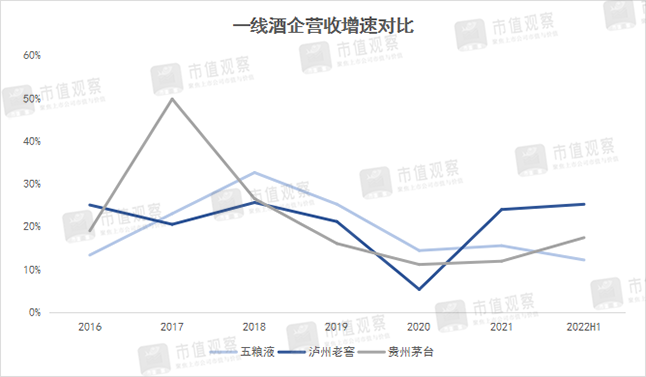纵观五粮液财报,2020年之后其业绩便一直处于失速状态,今年上半年还创下了自2016年行业复苏以来同期增速的新低。并且在当前以“茅五泸”为核心的一线酒企中,五粮液的增长最为逊色。