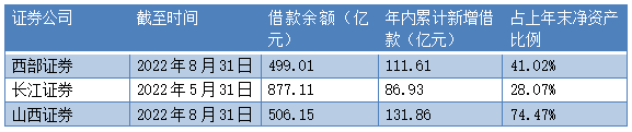 9月6日公告显示,截至2021年12月31日,西部证券经审计的净资产为272.09亿元,借款余额为387.40亿元。截至2022年8月31日,公司借款余额为499.01亿元,累计新增借款111.61亿元,累计新增借款占上年末净资产比例为41.02%,超过40%。