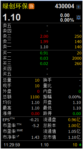 绿创环保最近几个月成交价格介于1元/股至1.3元/股之间,昨天1.1元/股的卖出报价完全没有成交,买一报价仅0.91元/股。