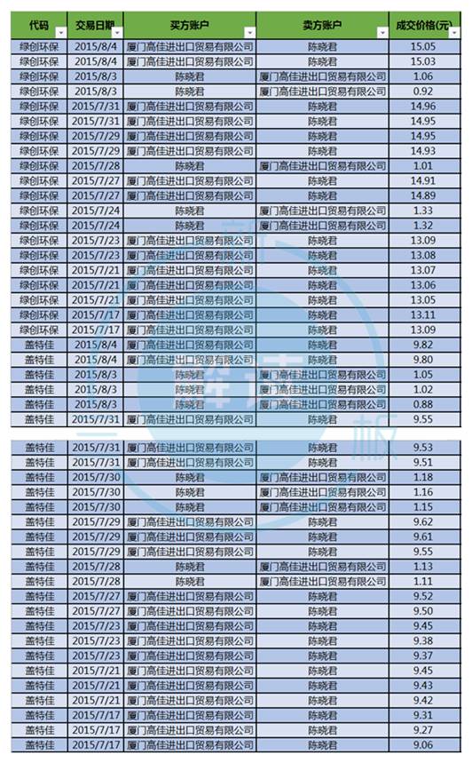 去年7月份至8月份,来自厦门的陈晓君与厦门高佳进出口贸易有限公司频繁操作绿创环保股票,仅出现在股转系统异常交易公示信息上的便有20笔。
