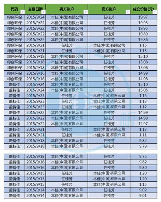 从去年9月14日开始,自然人账户任桂芳与厦门企业本佳(中国)有限公司反复对倒交易绿创环保和盖特佳的股票。例如,任桂芳9月14日以9.01元/股买入盖特佳,卖方为本佳(中国);本佳(中国)9月15日以1.15元/股卖出盖特佳,买方为任桂芳。