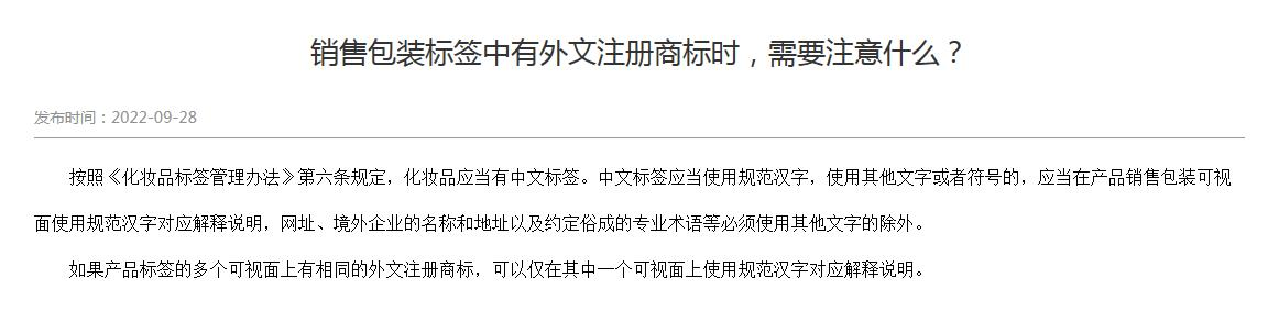 由此,今年7月20日,国家药监局在“化妆品监督管理常见问题解答(五)”中曾对“在我国上市销售的化妆品为何必须有中文标签?中文标签标注使用的文字有何具体要求”一问进行解释并称,“产品中文名称中的注册商标使用字母、汉语拼音、数字、符号等的,应当在同一可视面对其含义予以解释说明”。
