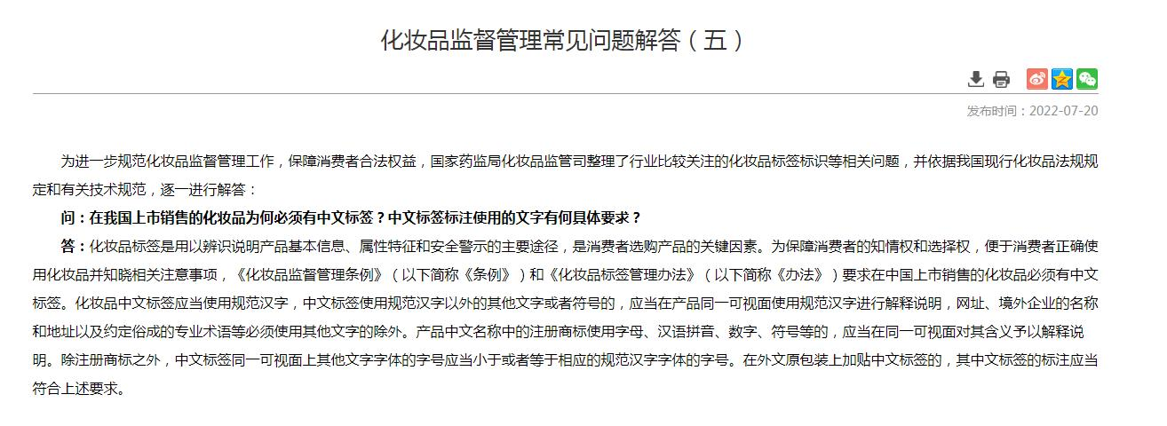 众所周知,《化妆品监督管理条例》和《化妆品标签管理办法》中明确要求“在中国上市销售的化妆品必须有中文标签”。
