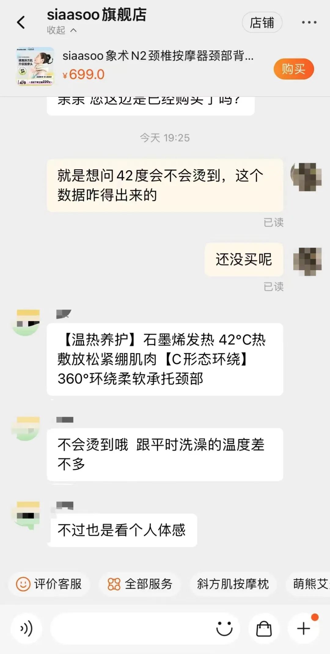 财经无忌以消费者身份随机进入象术天猫旗舰内询问其产品页面上“42°C热敷加速释压”的依据,客服并未正面回答,只反复强调其石墨烯材料的卖点。