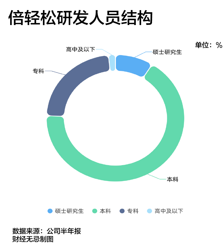 从人员结构来看,2021年上半年,倍轻松研发人员数量为123人,占公司总人数比例为12.18%,占比有所提升,但从研发人员的教育程度来看,硕士学历人数占比仅为8.94%。