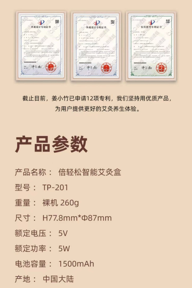 背后的原因并不复杂,艾灸盒同样仍是倍轻松按摩仪产品的复刻——用简单的智能化帮助传统艾炙换了个马甲。在姜小竹产品页面上展示出的专利成绩单上,更多的是外观设计专利,发明专利占比较低。
