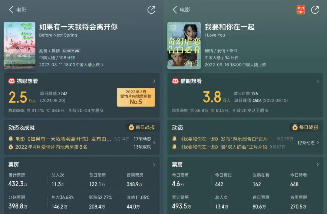 另一方面也是华策电影策略的预期落差。像《如果有一天我将会离开你》与《我要和你在一起》这两部主控项目,其共同点是都是青年导演的长片处女作。当然这样勇敢押注新人对于行业发展而言是具备积极意义的,但于观众来说,新导演意味着零认知,加之这类项目的演员阵容也知名度有限,选择观影无异于开盲盒。