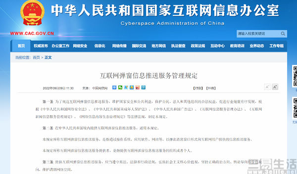 近日有消息显示,为规范弹窗信息推送服务,由国家互联网信息办公室、工业和信息化部、国家市场监督管理总局近日联合发布《互联网弹窗信息推送服务管理规定》(下文简称为《规定》),将从2022年9月30日起正式施行。
