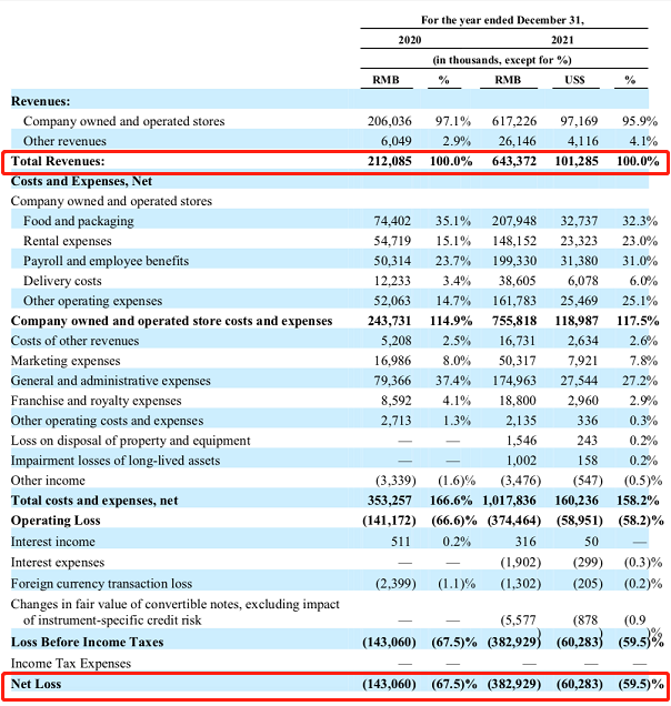 小食代翻阅的招股书显示, Tims中国2020年-2021年分别实现营收2.12亿元、6.43亿元,同比增长分别达到271.9%、203.4%。整体净亏损有所扩大,分别为1.4亿元和3.8亿元,但全公司净亏损营收占比持续收窄。