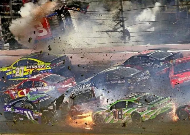NASCAR赛事中,赛车与赛车之间的距离很接近,互相之间很容易干扰,一旦有一辆赛车失控,周围又都是其他赛车,很容易招致连锁反应;而恰好NASCAR的赛车速度飞快,300km/h以上的失控,真的连上帝都没眼看了,再加上赛车之间离的很近,说是打保龄球吧,破坏力完全不是一个能级。其他比赛一次撞车顶多废掉三四台赛车,然而NASCAR一旦连锁反应,轻易就直接扫掉十来台赛车。