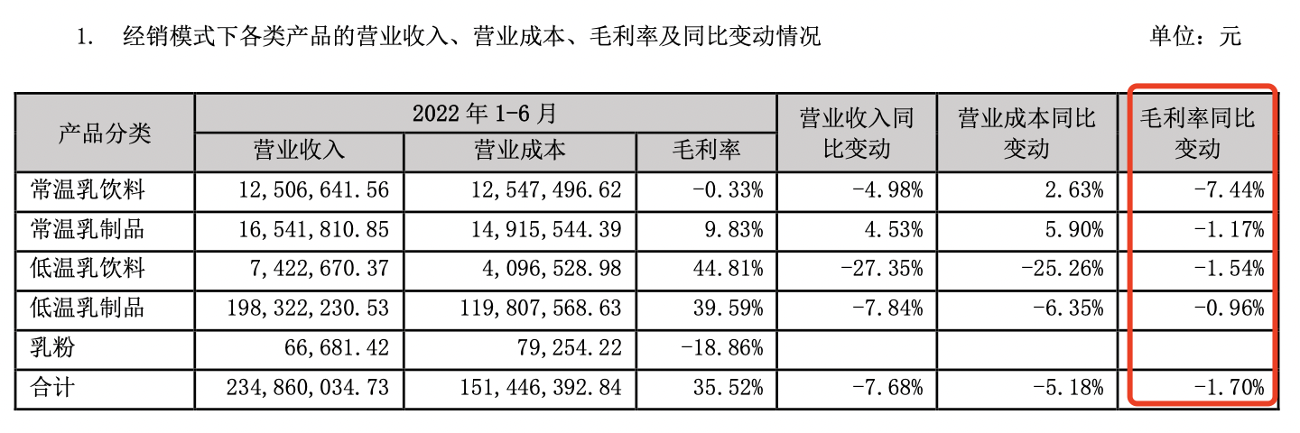 和许多小型乳企“上市即巅峰”一样,阳光乳业上市首份半年报就遭遇了滑铁卢——上半年营收2.71亿元,同比减少6.61%,净利润5566万元,同比减少7.72%,与此同时,阳关乳业所有品类的毛利率也出现了不同程度的下滑。