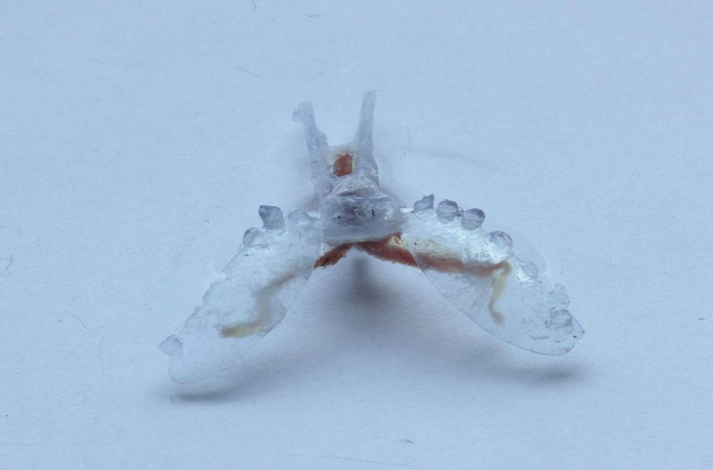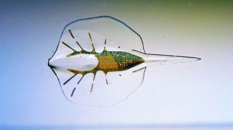鳐鱼的游泳技术一直备受自然学家和工程学家的赞赏,秘密就在于其平整圆滑的形状和起伏运动的胸鳍,以及游动时产生的一种名为“前缘涡”的力量。该团队通过对鳐鱼的生理机能进行逆向工程,创造出了长16毫米,重10克的微型机器人,看上去就像是一个透明硬币和一个尾巴的组合。
