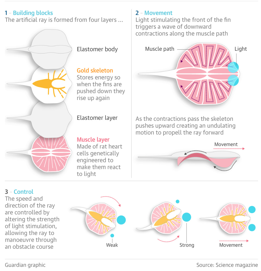 该团队首先使用一层透明的弹性聚合物做为主干部分;将大鼠心脏细胞以蛇形图案均匀分布在表面,再对细胞进行基因编码,使其对特定的蓝色闪光产生反应;用黄金制成支撑骨架,因为黄金对附着其上的细胞无抑制作用。