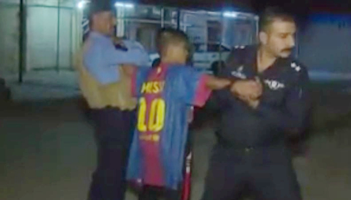 一名男孩身穿印有梅西名字的巴萨球衣站在街头,身边有两名警察。这两名警察把男孩的手架起,第三名警察在男孩的球衣下发现了缠在腰间的白色物体——自杀性爆炸腰带。