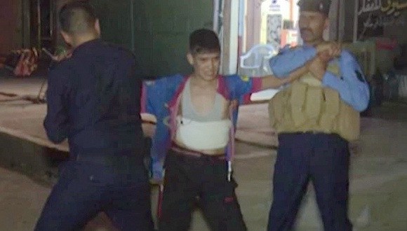 两名警察紧紧抓住男孩的双手,另外两名警察则小心翼翼地把爆炸腰带从男孩身上取下来。