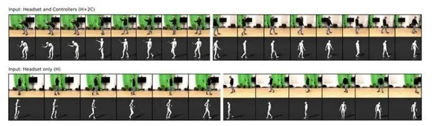 研究人员还进一步发现,即使不用手柄控制器,只需要头显的60个姿势(包含位置和方向数据),就足以重建各种运动姿态,还原出来的效果同样没有物理伪影(本不存在却出现在影像中的成像)。