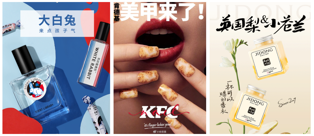 在食品方面,许多品牌也在围绕“气味”大做文章。大白兔曾和气味图书馆联名推出过“大白兔味香水”,一秒唤醒童年回忆;肯德基推出过炸鸡味香水、香氛蜡烛,甚至可以食用的原味鸡肉味指甲油,将原味鸡的“吮指”展现得淋漓尽致;前不久,悸动烧仙草还以祖玛珑经典香水为原型,推出“英国梨&小苍兰”香水果茶,将香水概念嫁接到茶饮上,上市两天就卖出50万杯。