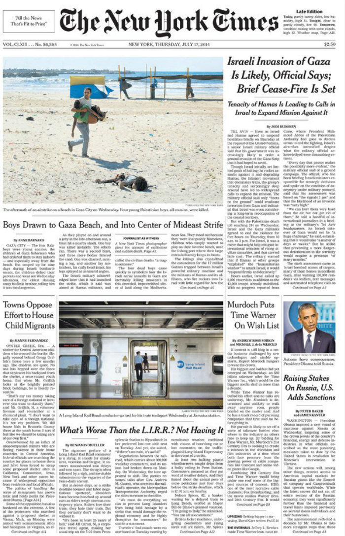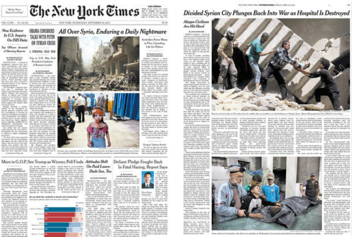 对《纽约时报》来说,平民在战争期间遭遇屠杀的图片许许多多,叙利亚只是其中之一。两年前,加沙一沙滩遭遇以色列炸弹袭击,《纽约时报》在当天头版上刊发了一张两个男孩遇难的照片,由普利策奖得主泰勒·海克斯(Tyler Hicks)拍摄。之后,《纽约时报》还刊发了无数张关于伊拉克战争的照片。