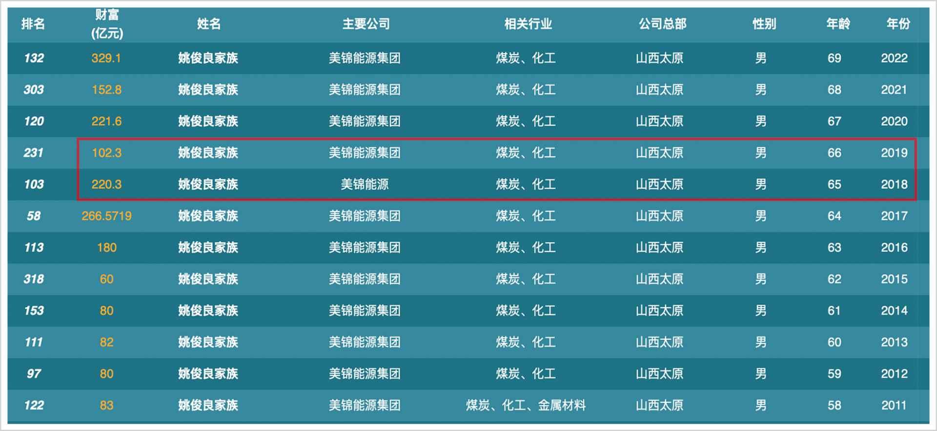 在煤炭“黄金十年”,姚俊良抓住机遇,一跃成为山西大型煤化工民营企业集团。2006年,美锦能源借壳上市,姚俊良凭借40.3亿元财富位列福布斯中国富豪榜41位,斩获“山西首富”。