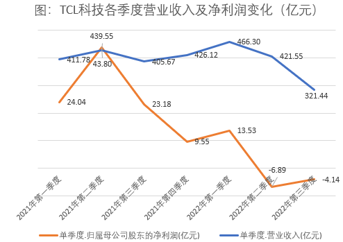 结合TCL科技半年报测算,今年三季度公司实现营业收入311.44亿元-331.44亿元,实现归属于上市公司股东的净利润-4.64亿元至-3.64亿元。环比二季度,公司三季度营业收入下滑约24%,亏损幅度有所收窄。