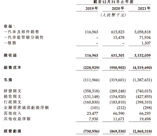 威马汽车2019-2021年部分业绩表现,截图自招股书