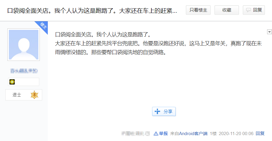 早在2020年底,就有用户在网上发帖称发现口袋阅的天猫店铺关了,怀疑其要“跑路”,到了今年6月,又有人发现口袋阅的“官微关了”。