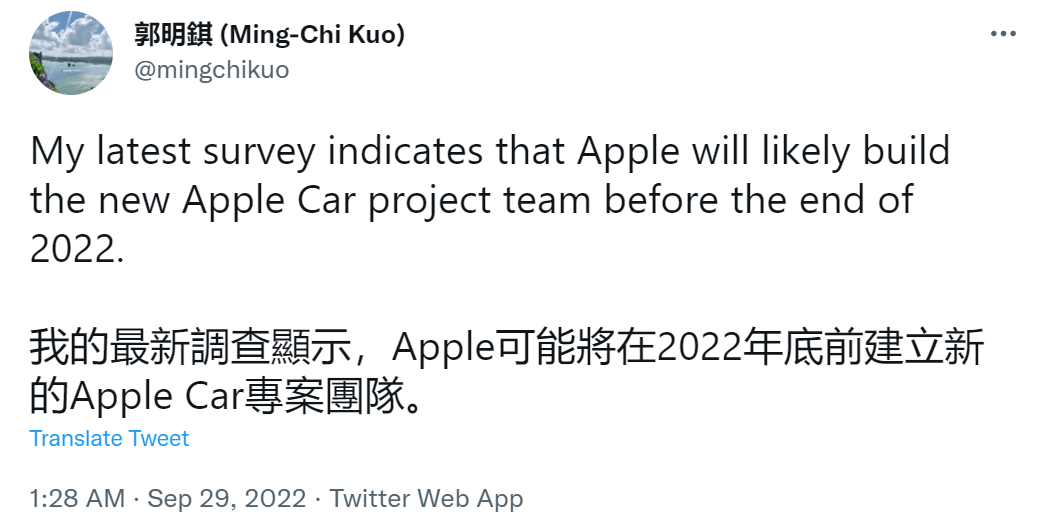 9月29日,著名苹果分析师郭明錤爆料称,据他最新的调查显示,苹果很可能在2022年底前建立新的苹果汽车项目团队。