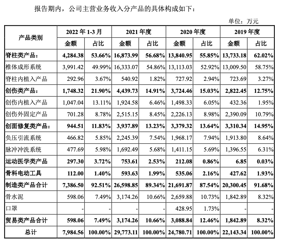 爱得科技主要从事以骨科耗材为主的医疗器械的研发、生产与销售,主要产品包括脊柱类、创伤类、运动医学等骨科医用耗材以及用于伤口疗愈的创面修复产品。