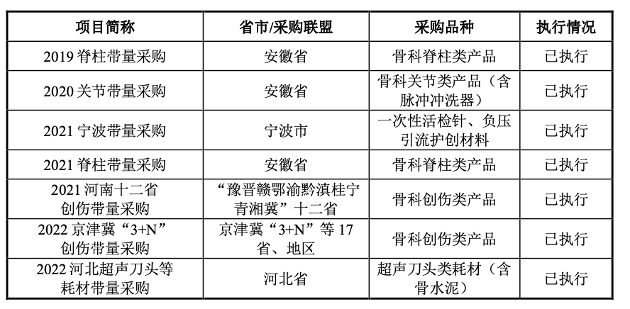 界面新闻记者注意到,爱得科技的部分产品中标了骨科类集中带量采购,截至本招股说明书签署日,各省市自治区、采购联盟及个别地级市组织涉及公司产品的骨科类带量采购项目共计10次,其中公司中标项目共计7次,具体情况如下: