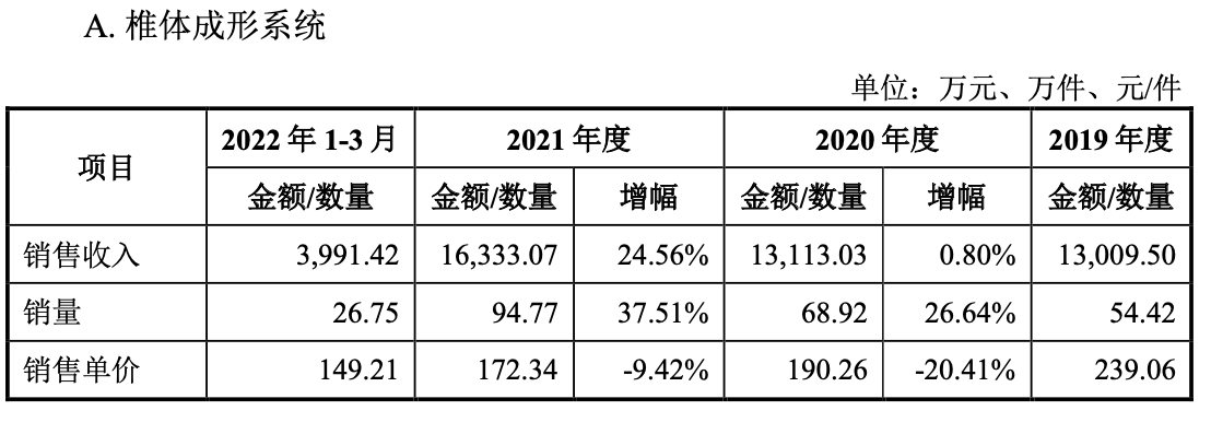 以核心产品椎体成形系统为例,公司分别在2019年和2021年两轮安徽省脊柱类产品带量采购中中标椎体成形系统和脊柱内植入产品,因此,2019年-2021年该产品的销售单价连续下滑,但因“以量换价”销量连续上升。