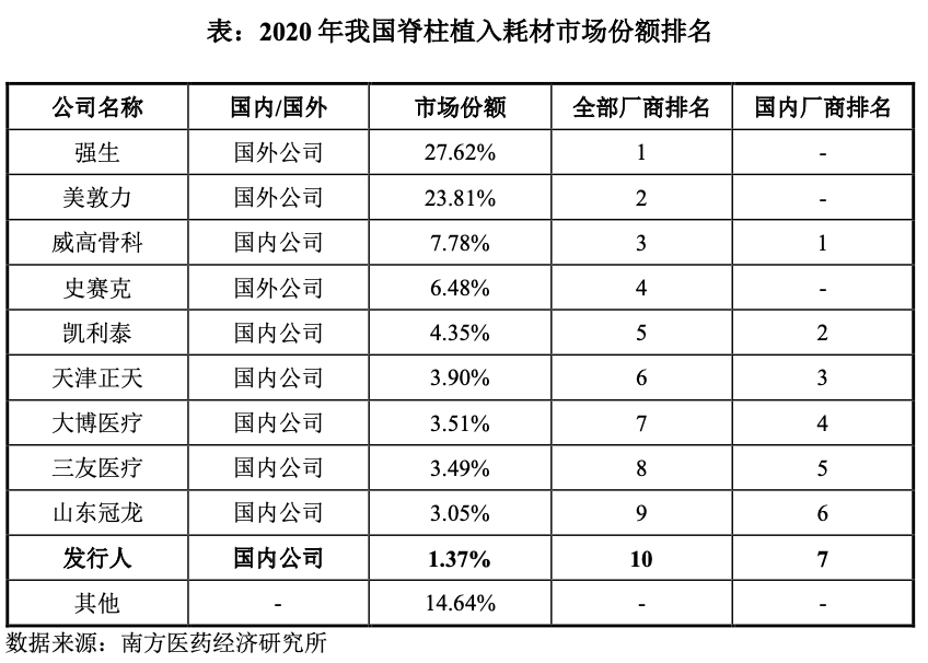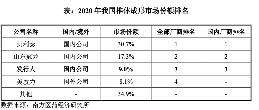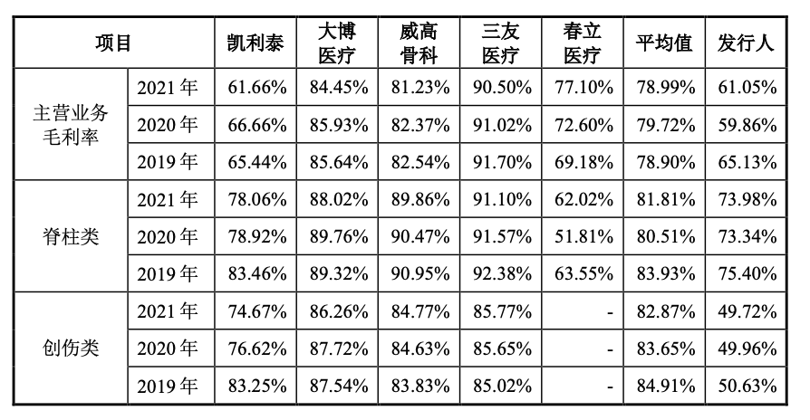 招股书显示,公司将自身归类于第二梯队,可比公司包括综合型企业威高骨科、大博医疗,细分龙头企业凯利泰、三友医疗、春立医疗等。