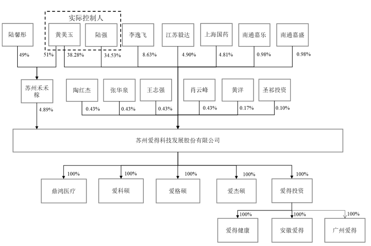 IPO前,陆强和黄美玉为爱得科技的控股股东和实际控制人,其中陆强直接持有公司34.53%的股份,黄美玉直接持有38.28%的股份,同时通过苏州禾禾稼控制公司4.89%的股份,因此两人直接持有和控制爱得科技77.07%的股份。