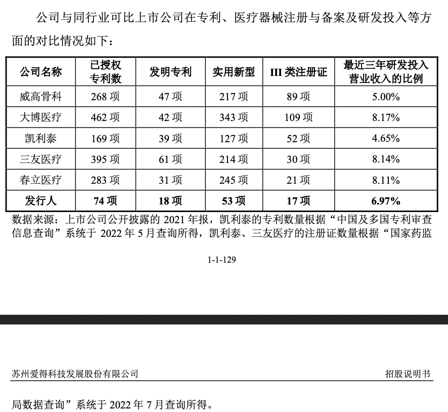 此外,从技术实力来看,爱得科技的发明专利、III类产品注册证数量也远不及同行们。