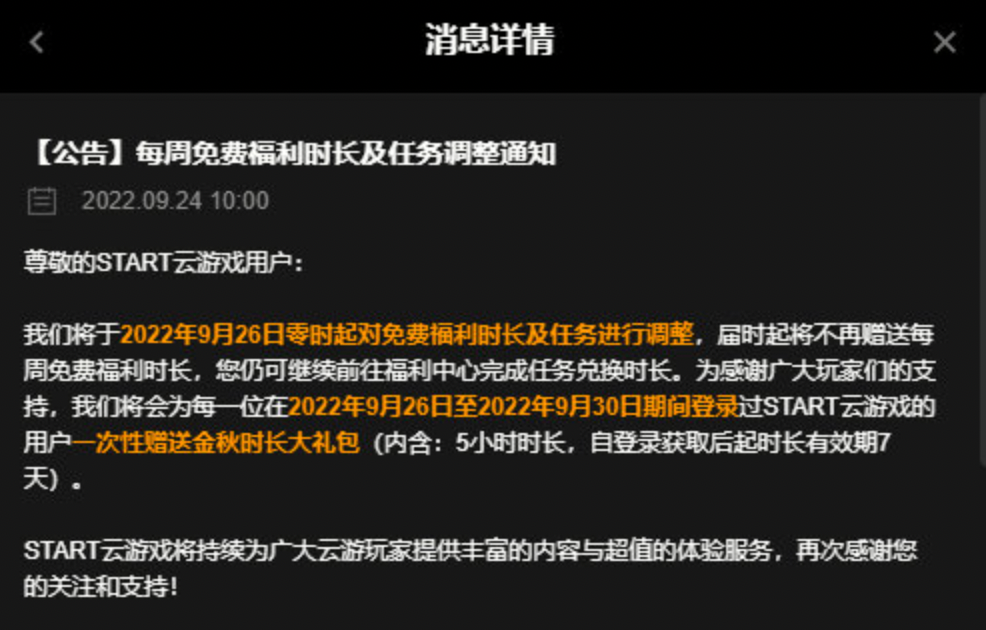 如同腾讯云游戏主机所受的冷遇一样,云游戏在国内一直处于“雷声大,雨点小”的状态。在推出云游戏主机的同时,腾讯START云游戏官方发布公告称,不再赠送每周免费时长。