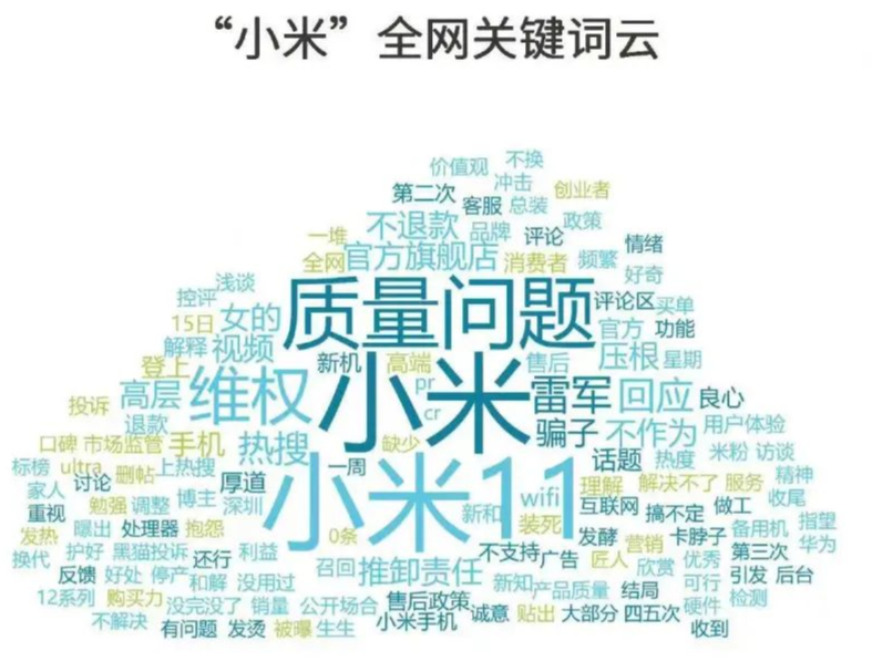 除了微博热搜话题下网友对小米的不满之外,在黑猫投诉平台上搜索“小米”,相关投诉量高到87050条。另根据新浪舆情通数据,在当前全网关键词云中,与小米相关的“质量问题”“维权”等字眼分外醒目。