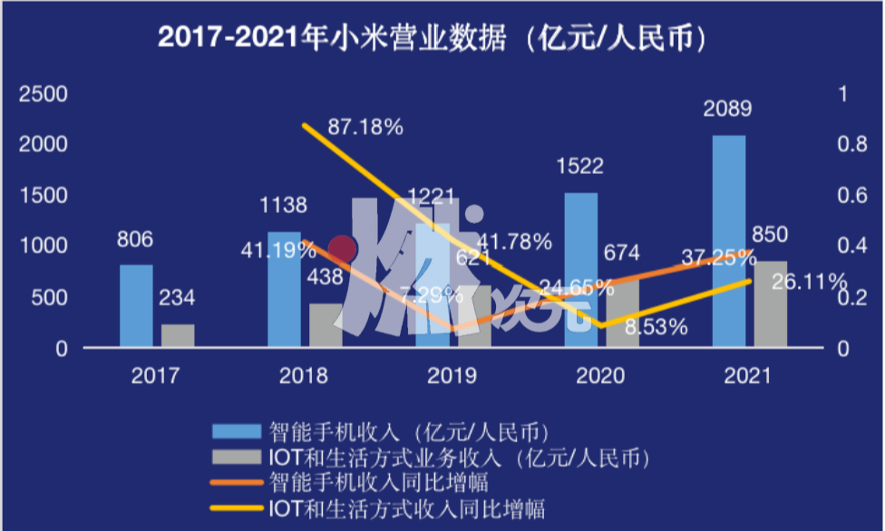根据财报,2018、2019年小米IoT和生活方式业务收入分别实现438亿元和621亿元的营收,同比增幅分别为87.18%和41.78%。
