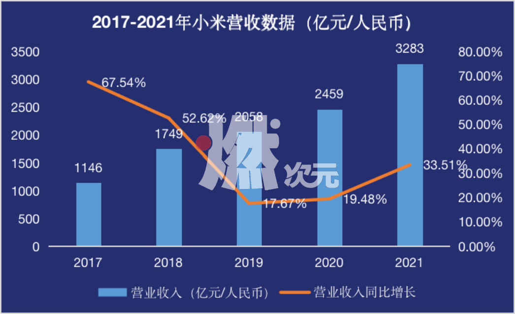 根据财报,小米2019年实现营收2058亿元(人民币,以下未标注则同),较2018年同比增幅仅为17.67%,而2018年小米的营业收入较2017年同比增幅达52.62%。