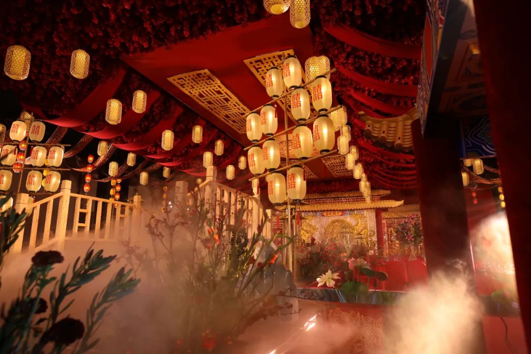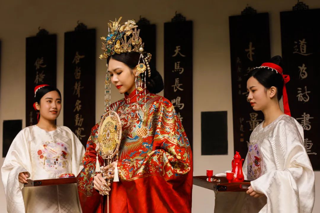 这是一场复刻古代婚礼的中式婚宴,新娘身着重达二三十斤、镶嵌红宝石的全金定制凤冠和金丝霞帔,婚礼现场除了全鲜花的配置,还购入上百条锦鲤投入在鱼池中。