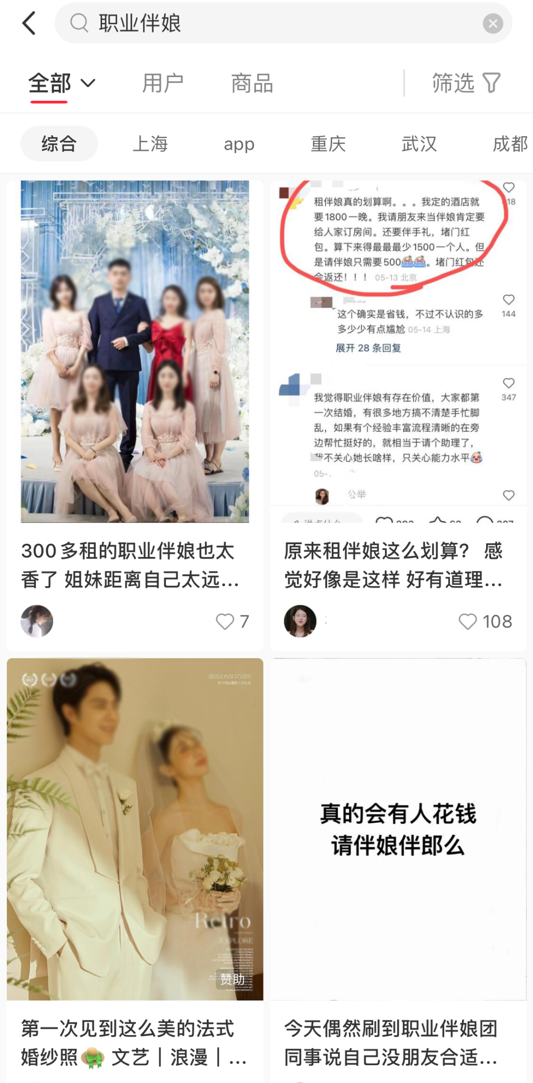 《第一财经》2021年发布的数据显示:30-34岁和35-39岁这两个结婚年龄段的占比,都创下了近年来的新高。国人的晚婚趋势,让许多人在结婚时难以从身边找到未婚且适龄的婚伴,进而推动了婚伴市场的兴盛。小红书上,你能看到不少用户发帖求“职业伴娘”。