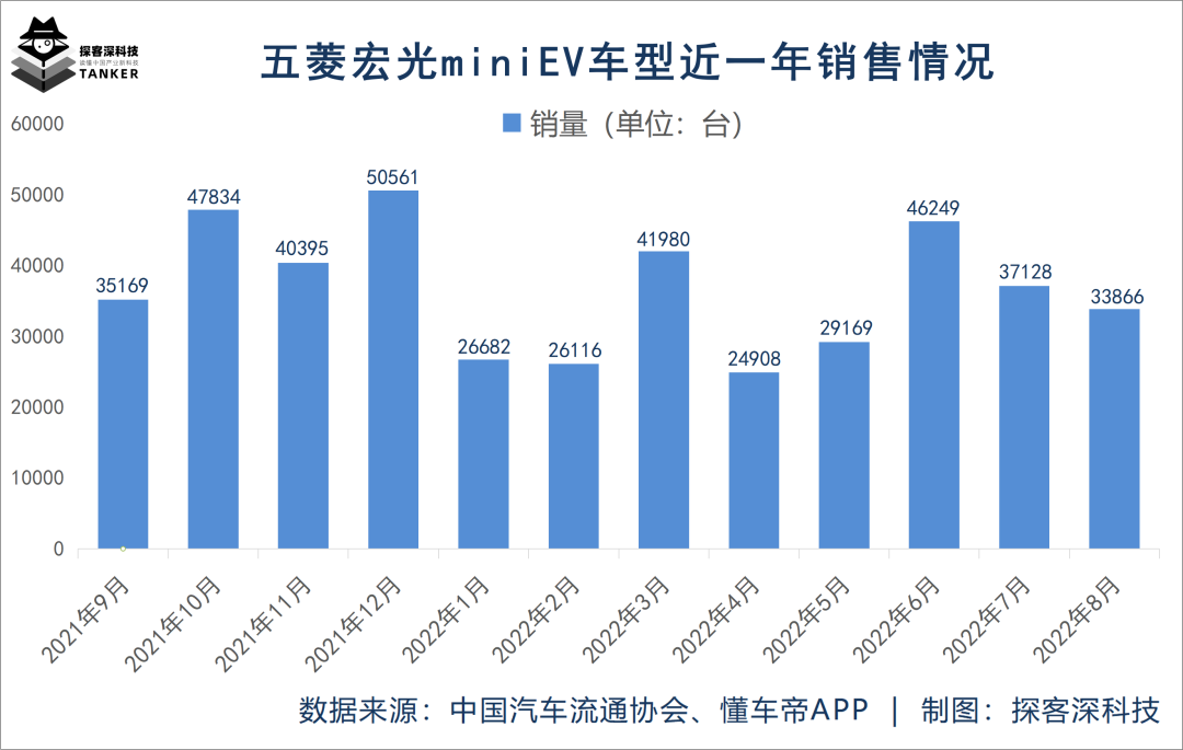 如果说一两个月的数据表现可能会有一些偶然性,那么结合近一年的销售数据看,宏光mini的销量下行还是较为明显的。