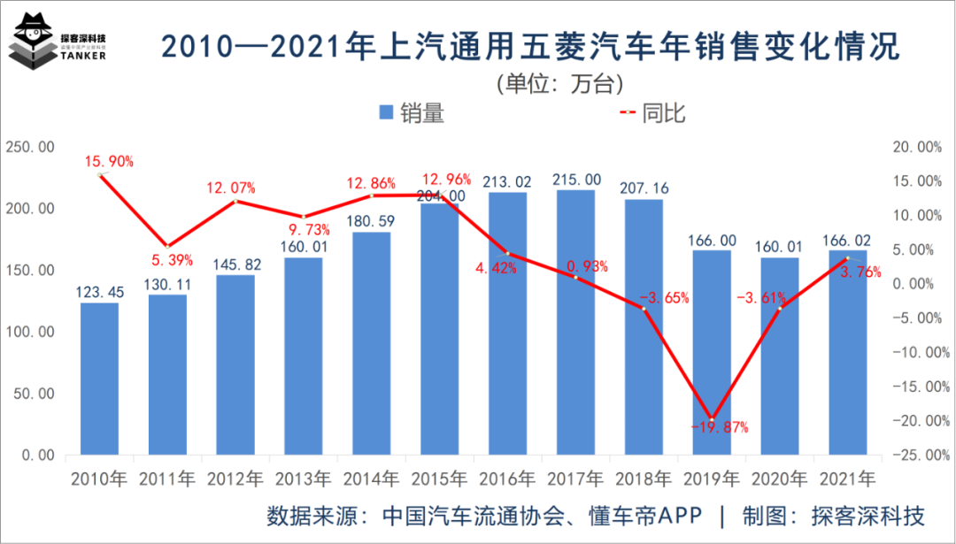 「探客深科技」从东方财富Choice平台获悉,五菱的年销量从2010年的123.45万台,一路攀升至2017年的215.00万台。随后自2019年开始出现明显的下滑,并于2020年回落至160.01万台,同比增速也从2010年15.90%的增长下降至2019年19.87%的下滑。
