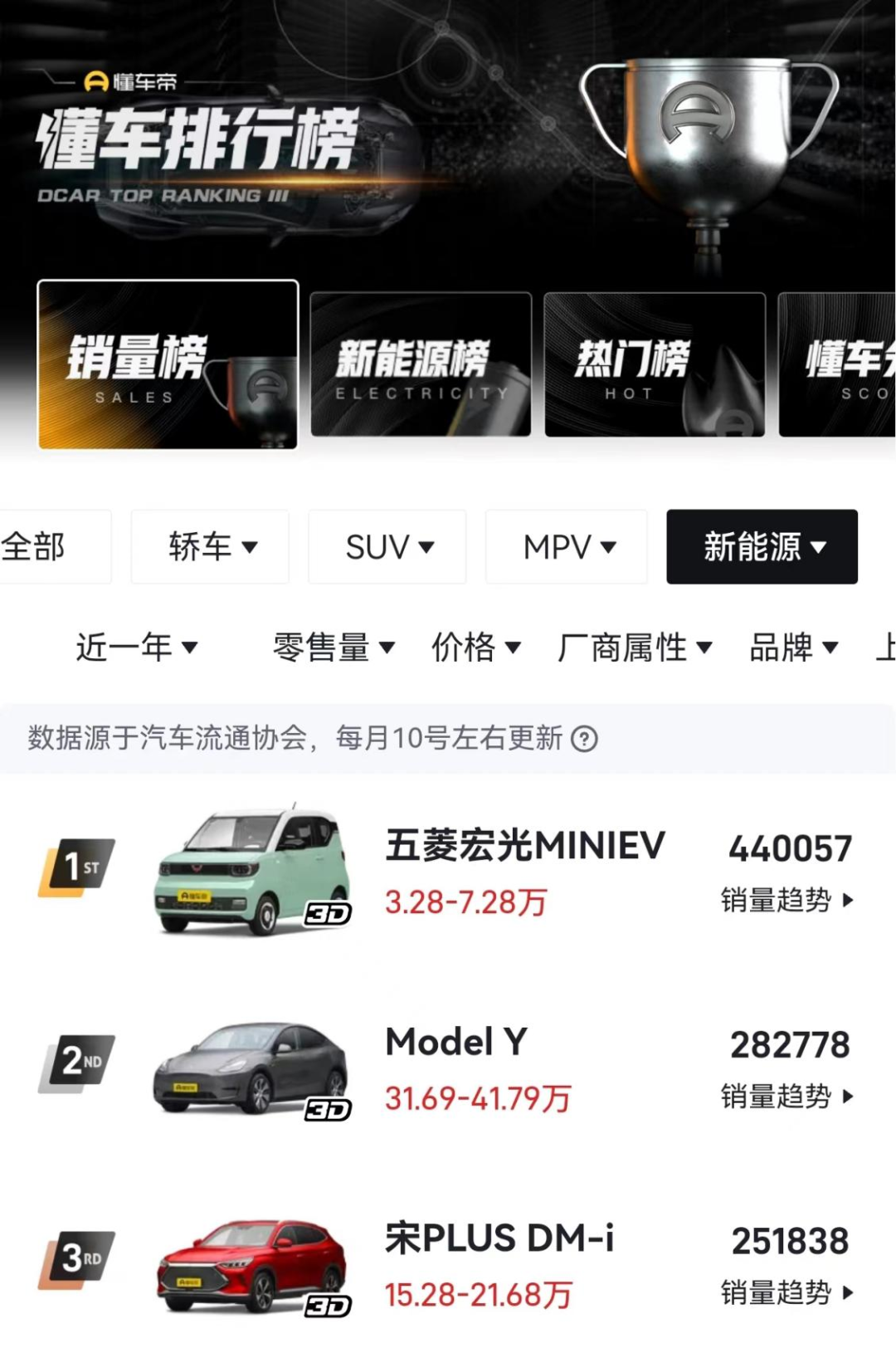 若是从新能源榜单来看,宏光mini车型不仅以44.01万台的销量位居近一年销量榜单的第一名,同时还是第二名特斯拉ModleY车型销量的1.54倍,是第三名比亚迪宋PlusDM-i车型销量的1.74倍。