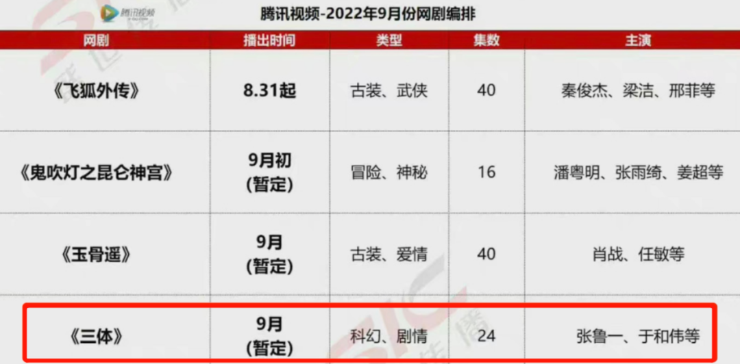 日前,腾讯视频还一度将《三体》放在9月份网剧的编排表上,但如今已是月底,尚无《三体》的定档消息传出。