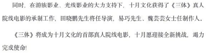 11月,前游族影业CEO孔祥照(微博ID:孔二狗)发博称,《三体》电影正处于后期阶段,“具体时间不敢说,但一年内肯定面世”。