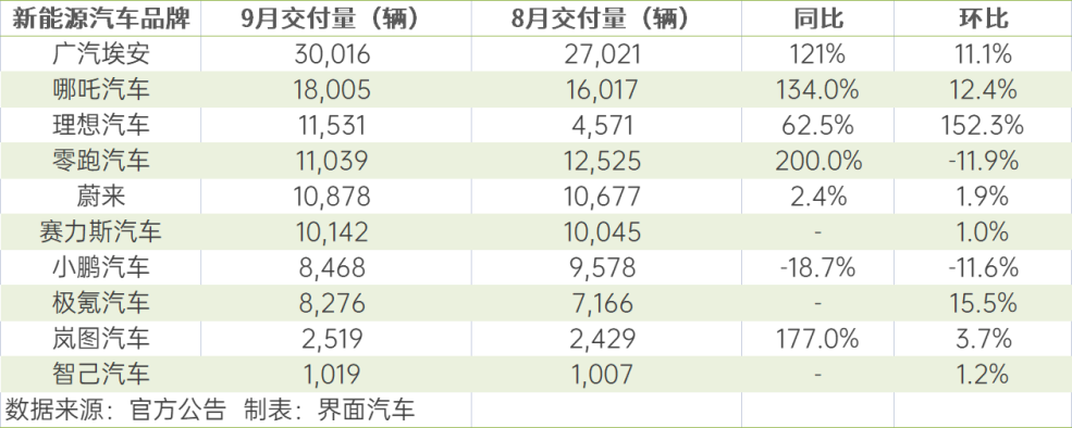 界面新闻统计发现,共6家品牌交付量破万,埃安以30016辆继续领跑第一,本月交付量首次突破3万,理想汽车重回万辆级别。