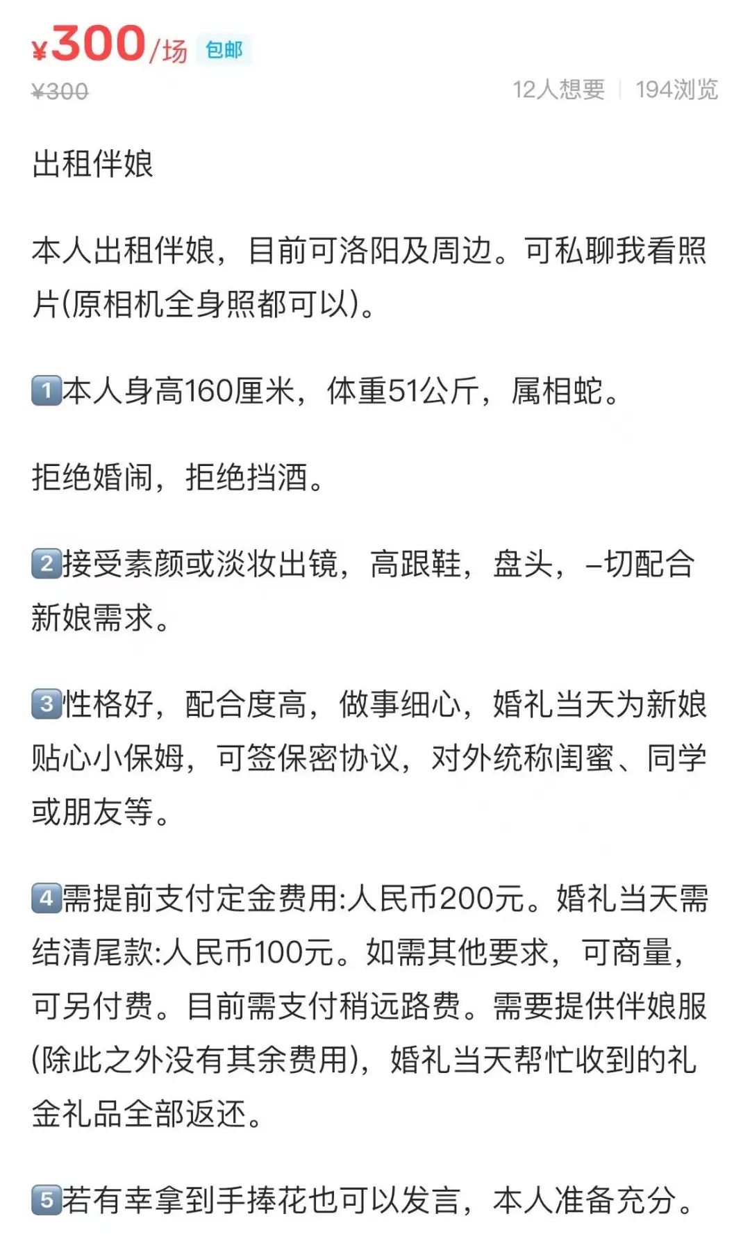 从9月初开始,闲鱼上就出现了许多“国庆假期兼职伴娘”的内容,“卖家”来自全国各地。根据地区、路程和时长不同,一般收取费用200元-500元不等。
