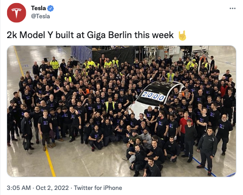 北京时间10月2日,特斯拉官微发布消息称,德国柏林超级工厂Model Y周产量突破2000辆。据悉,于2022年3月22日开业的柏林超级工厂,Model Y周产量在6月中旬达到1000辆。