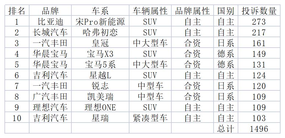 具体车型方面,比亚迪在过去的9月占据投诉榜单头名,上榜车型为宋Pro新能源,该车型8月排名第4,总计投诉量273例。消费者主要对其无法按合同约定时间完成车辆交付感到不满;与此同时,分期购车价格不透明和服务态度投诉也偶有出现。