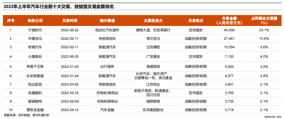 上半年汽车行业前十大交易中,交易轮次以战略投资或收购为主,重点布局新能源汽车制造领域。交易金额最大的活动为宁德时代定向增发450亿元,占同期总交易额25.1%。交易金额排名前5的标的公司分别为宁德时代、华晨宝马、奇瑞汽车、赛力斯和幸福千万家,5家公司交易金额在同期总交易额占比超50%。